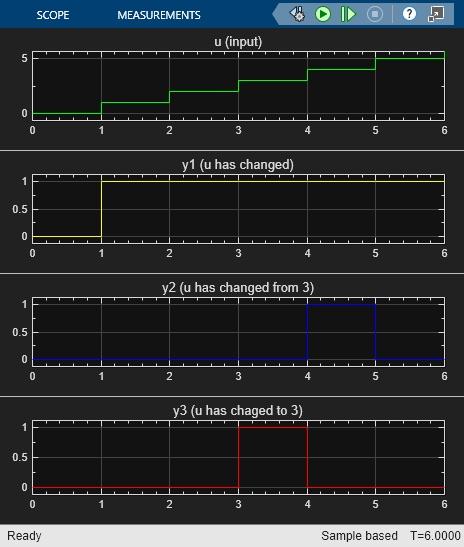To check the signal, the block calls three change detection operators and specifies six requirements. Each change detection operator determines the value of the output data y1, y2, and y3.
