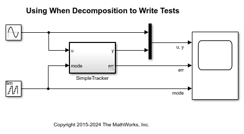 This example shows how to use verify statements in a when decomposition in a Test Assessment block to author assessments in a test harness.