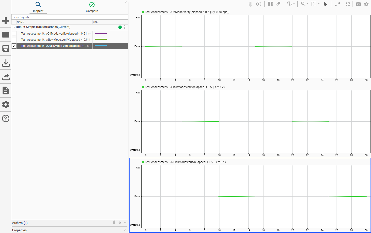 To run the assessments, simulate the test harness. Open the Simulation Data Inspector to inspect the results.