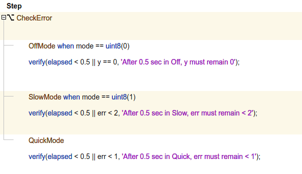 If your model uses a Test Sequence as a block source, you can connect the Test Sequence and Test Assessment blocks by using the active step signal from the Test Sequence block. You can create a when decomposition in the Test Assessment block and define verify statements to assess the model simulation.