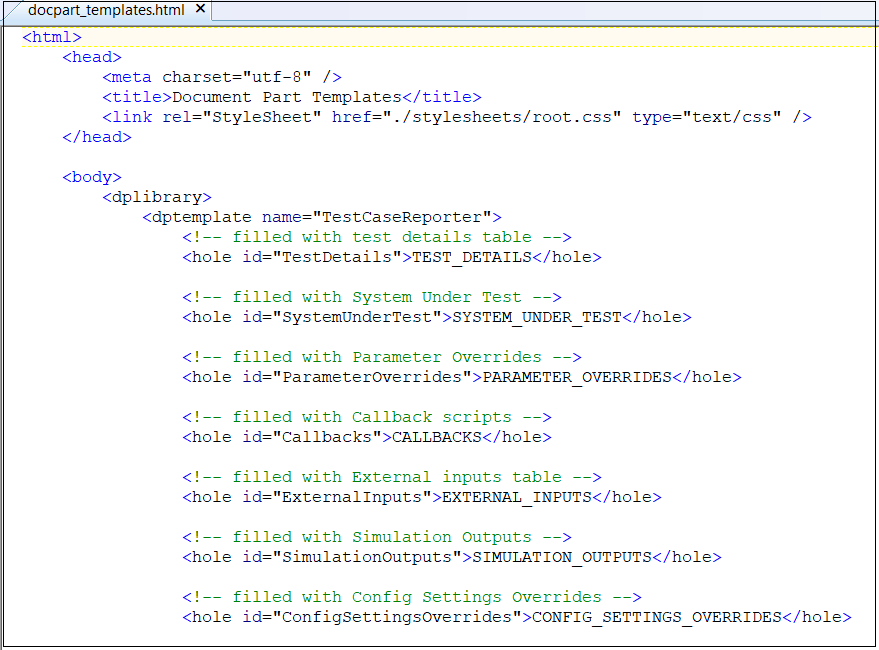3. Open and edit the docpart_templates.html file using a text editor. This file lists the content holes in the order in which the content appears in the report. Content holes are filled with the associated data when the report is generated. In this template file, you can reorder the report sections and delete template holes. This image shows a portion of the default docpart_templates.html file.