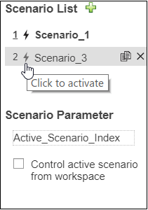 You can alternatively use a variable in the base workspace, model workspace, or a data dictionary to programmatically control the active scenario. To activate a scenario, set the variable value to the index of the scenario.