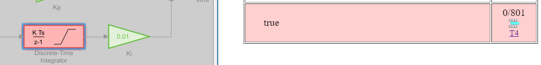 Open the PI Controller and click on the Discrete-Time Integrator block. The Coverage Details show that the true decision for the upper limit was executed by the Increment Test (T4), rather than the Throttle Test (T6). Since the block is part of the implementation of the THROTTLE requirement, it should have been tested by the Throttle Test, which verifies the THROTTLE requirement. The Increment Test does not verify this requirement and does not contribute coverage for this block when the Scope model coverage to linked requirements setting is enabled.