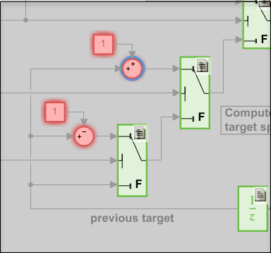 Open the Controller subsystem. Blocks that do not have 100% coverage appear in red. Two sets of Constant and Sum blocks are not linked to requirements and were never executed.