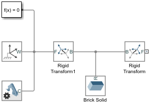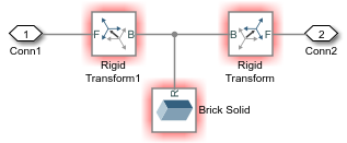 Flip the Rigid Transform1 block so that you can connect the B ports of two Rigid Transform blocks to each other and the Brick Solid block.