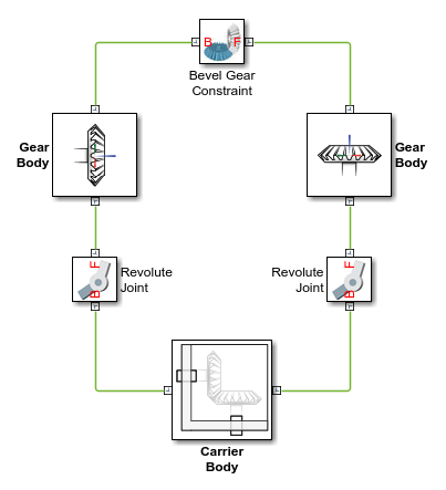 Gear constraints occur in closed kinematic loops. The figure shows the closed-loop topology of a simple bevel gear model. Joint blocks connect the gear bodies to a common fixture or carrier, defining the maximum degrees of freedom between them. A Bevel Gear Constraint block connects the gear bodies, eliminating one degree of freedom and effectively coupling the gear motions.