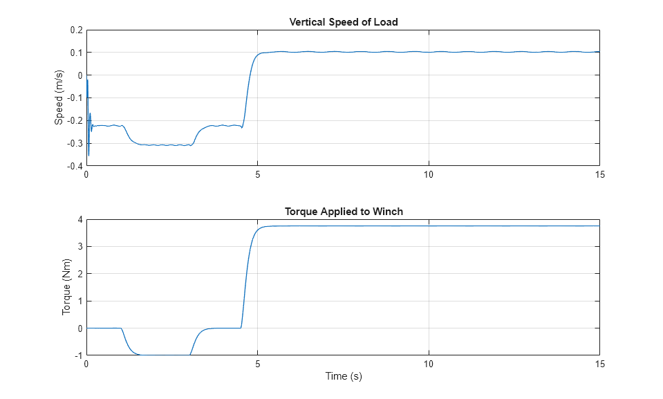 The plot below shows the torque applied to the winch and the vertical speed of the load. Note that for the first second, no torque is applied to the winch, but the load still moves due to gravity.