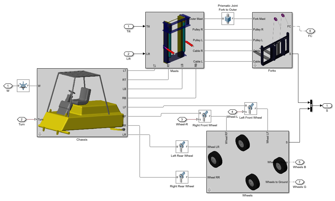 This example models a forklift which uses the hydraulic and pulley mechanisms to perform the lift action. The tilting of masts is also controlled by hydraulic cylinders. The forklift comprises of 3 masts, namely main mast, top mast and fork mast. The main mast is connected to the chassis by revolute joints and its tilting is governed by the hydraulic tilt cylinders. The top mast slides over the main mast and its motion is governed by the hydraulic lift cylinders. The fork mast slides on the top mast and hangs through belt-cable circuits which drives the movement of the fork mast. A common warehouse application is shown in this example where the objective of the forklift is to grab a box, pass over a bump and place the box in the racks. Spatial Contact Force blocks are used at all contact locations to model the contact between the bodies. The contact between the ground surface and the wheels are modeled using infinite plane block and the contact between the forks and the box are modeled using the point blocks.