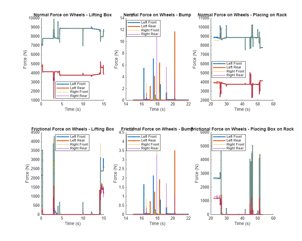 The plot below shows the Normal force and Frictional force at each wheels during the lift, bump and place motion of the forklift.