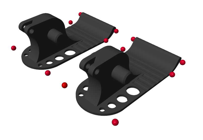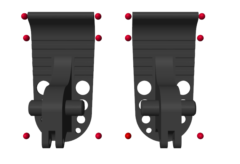 The model uses Spatial Contact Force blocks to simulate the contact between the feet and ground. To simplify the contact and speed up the simulation, red spheres are used to represent the bottoms of the robotic feet. For more details, see Use Contact Proxies to Simulate Contact.
