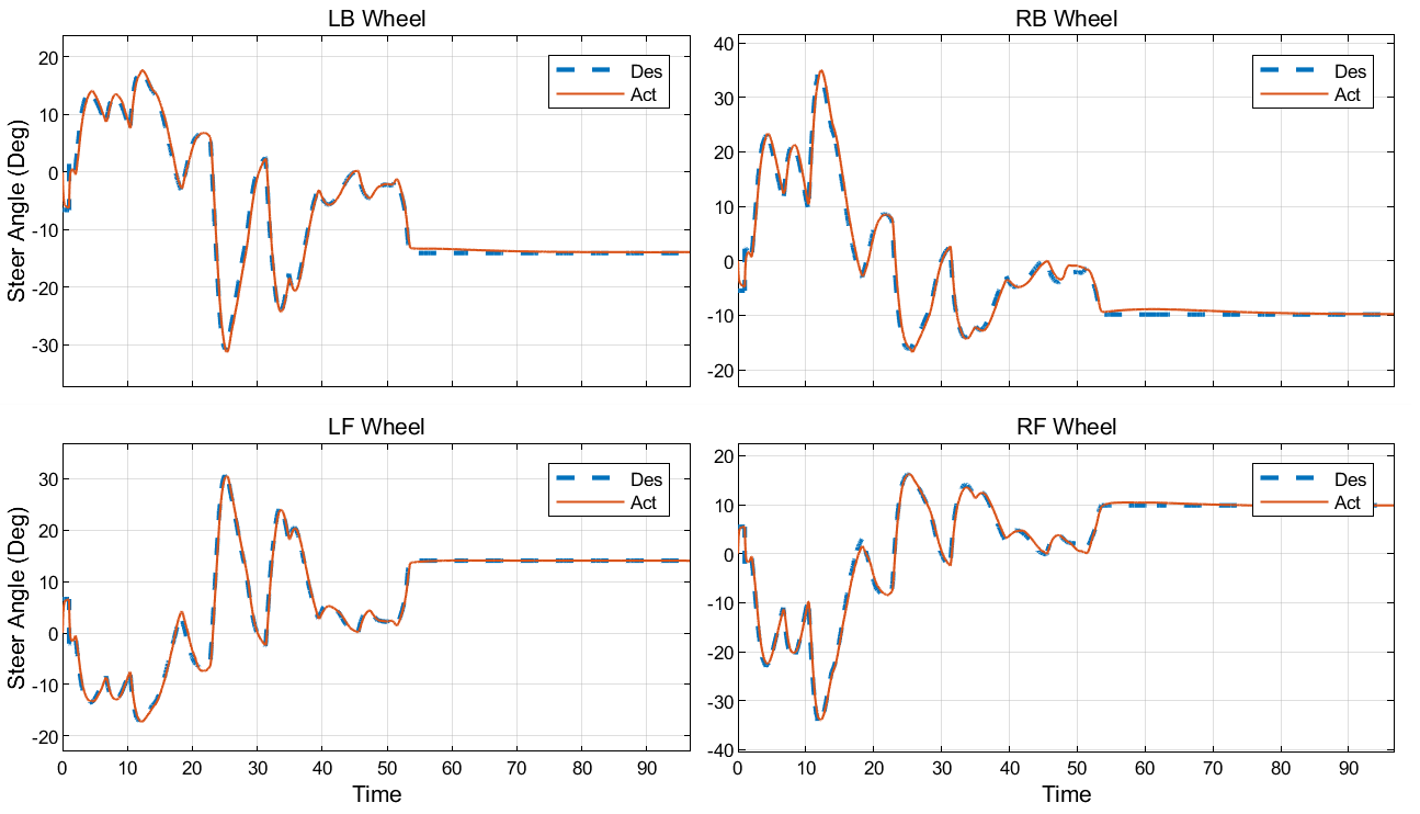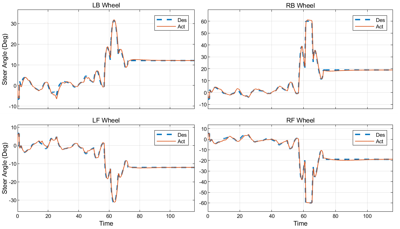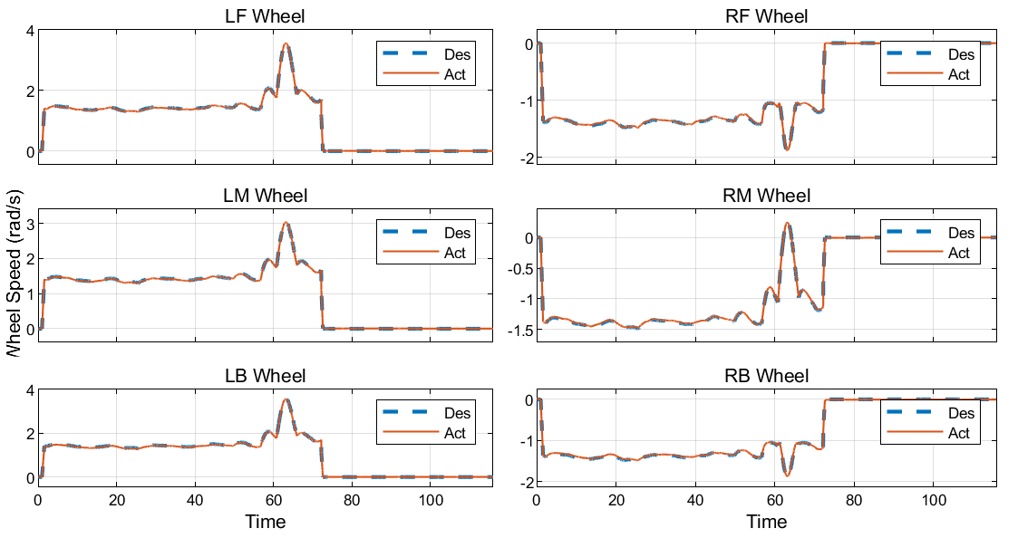 Once both the steering angles and the wheel speeds are formulated for the desired path and the desired chassis linear velocity, a PID controller is used to drive the actual steering angles and the angular rates of the actuators (revolute joints) to their desired values.