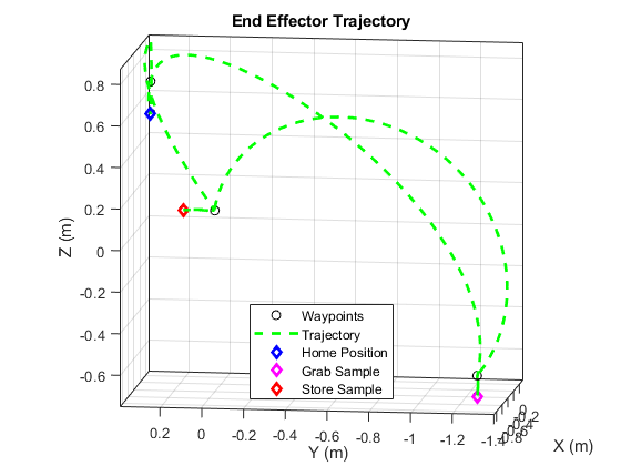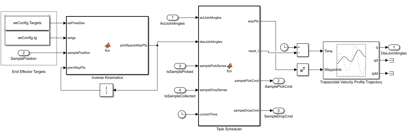 KinematicsSolver(requires a Simscape Multibody license) and Trapezoidal Velocity Profile Trajectory (Robotics System Toolbox) (requires a Robotics System Toolbox license) for joint space trajectory planning and control of the rover arm.Joint mode configuration (requires a Simscape Multibody license) for modeling the interaction between the end effector and the sample. For more information about the mode configuration, see the Mode Configuration section of the Revolute Joint block.