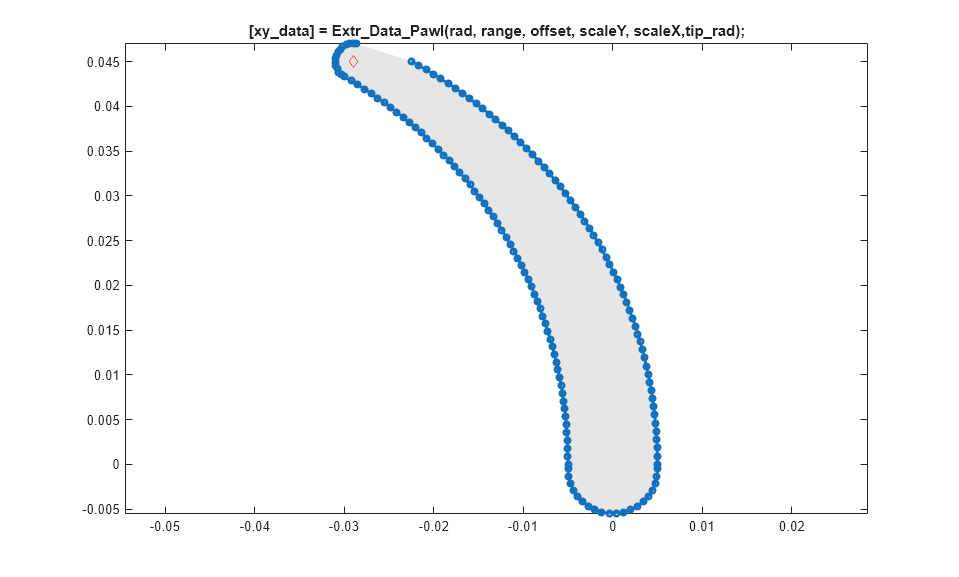 This plot shows the extrusion data for the pawl. This was created in MATLAB and was used to generate the location for the frame where the contact geometry is placed at the tip of the pawl.
