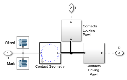 The wheel subsystem models the mass and inertia of the wheel, contact geometry for the edges of the wheel, and contact forces between the wheel and pawls. Simscape Bus blocks are used to group the geometry connections for each of the line segments representing the teeth edges.