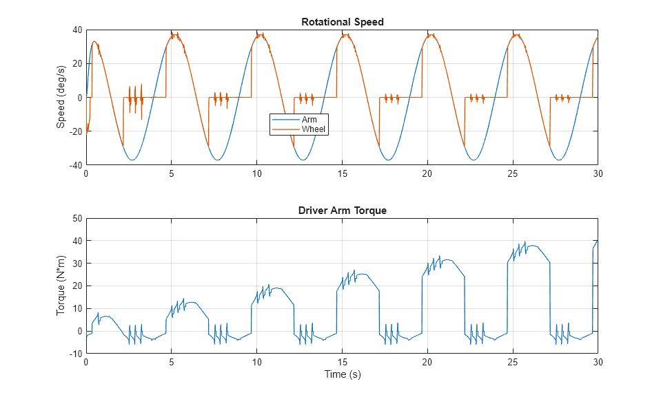 The rotational speeds of the wheel and driver arm are plotted below. The arm and wheel rotate at nearly the same speed as the driver arm rotates counterclockwise. The wheel stays nearly still as the drive arm rotates clockwise. The spikes in the wheel speed are due to the contact forces between the pawls and the wheel.