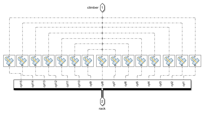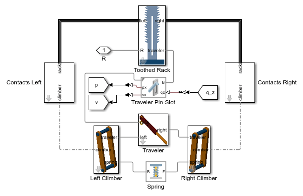 The Spatial Contact Force blocks that are used to model the contact forces between the climbers and rack teeth are housed in the Contact subsystems.