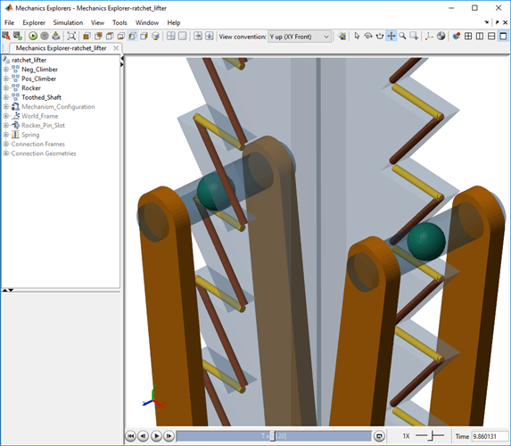 In this example, as the traveler handle is pumped up and down, the traveler climbs up along the toothed rack to lift a load. To simplify the contacts between the toothed rack and climbers, the model represents the rack teeth and climber shaft-pins with proxies, such as cylinders and spheres, and simulates the contacts between these proxies.