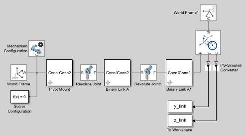 y_linkandz_link.Connect the blocks to the model as shown in the figure. You must connect the base frame port of the Transform Sensor block to the World Frame block. The new blocks are shaded gray.