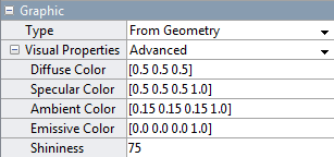 Advanced.Expand the Visual Properties node. The solid colors and shininess appear as the active visual property parameters.