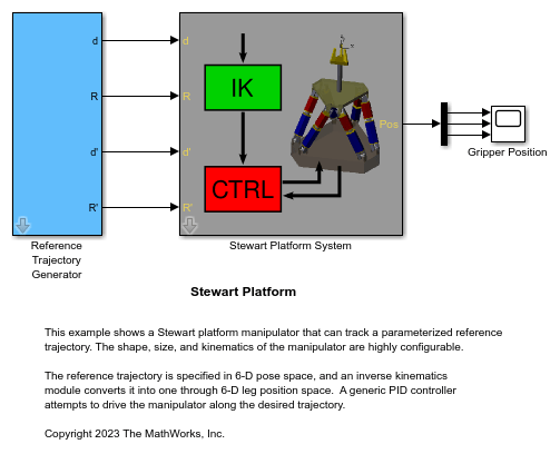 This model shows a Stewart platform manipulator that can track a parameterized reference trajectory. The shape, size, and kinematics of the manipulator are highly configurable.