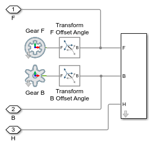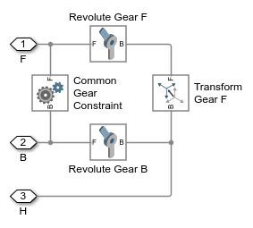 The Common Gear Constraint requires that the rest of the mechanism hold the two frames to which it is connected in alignment. This subsystem has the necessary constraints and parameterized Rigid Transform to hold the frames in the right position and orientation.