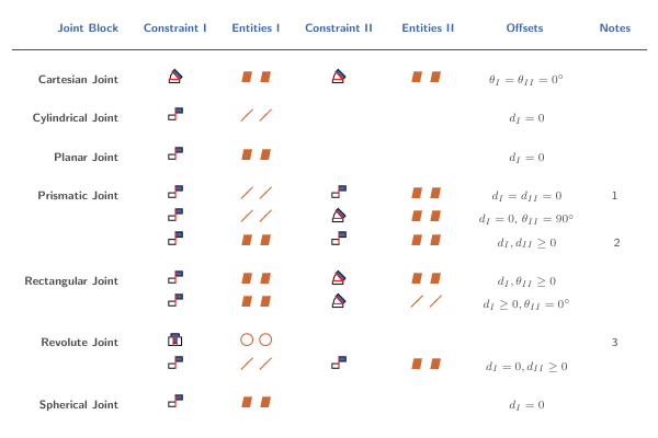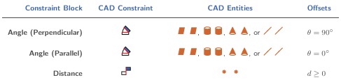 The table shows the Constraint blocks that different constraint combinations map into. Different constraints can map into the same Constraint block if they provide the same degrees of freedom. Angle offsets must be either 0 or 90 degrees. Other offsets are not supported. For a legend of the icons in the table, see CAD Constraints and Entities.