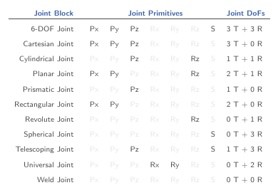 Joint blocks are assortments of joint primitives, basic yet complete joints of various kinds you cannot decompose any further—at least without losing behavior such as the rotational-translational coupling of the lead screw joint. Joint primitives range in number from zero in the Weld Joint block to six in the Bushing Joint block. There are five joint primitives:
