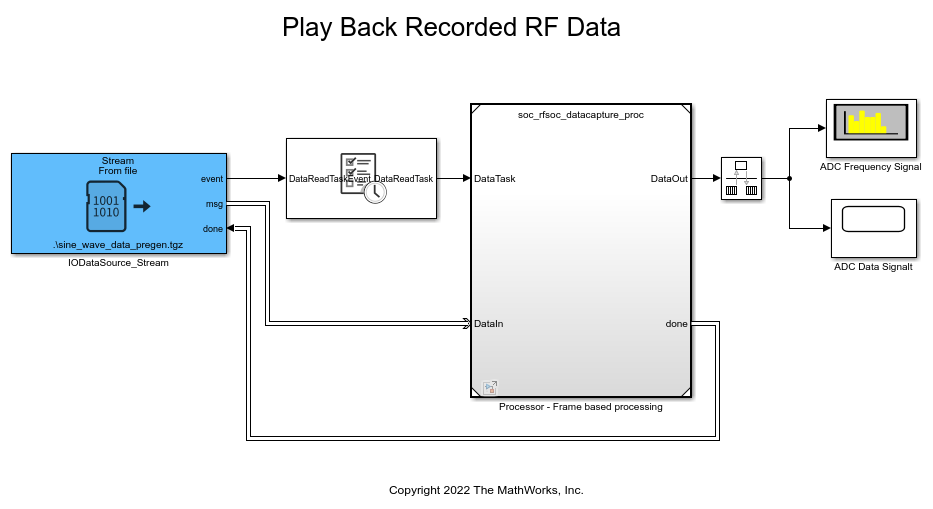 open_system('soc_rfsoc_datacapture_playback'). This model uses the IO Data Source block to parse the data file.Open the IO Data Source block mask. Click the Browsing button and select the data file