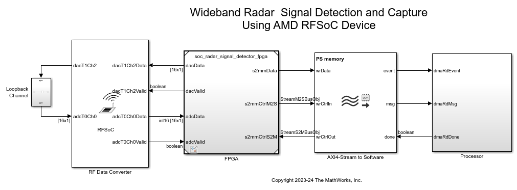 This example shows how to build, simulate, and deploy a wideband radar signal detection and capture system in Simulink®. You use an SoC Blockset™ implementation and use it to target the AMD® Zynq® UltraScale+™ RFSoC evaluation kits. Using this example, you can detect radar signals over a 2 GHz bandwidth and capture the detected signals for further analysis. You partition the wideband radar signal detection and capturing functionality across the FPGA and the processor on the RFSoC device. The FPGA handles the wideband signal processing and the processor handles the system control, configuration, and status update. You also implement a radar emulator to generate pulsed radar signals and use these signals to evaluate the wideband detection and capturing capability of the system.