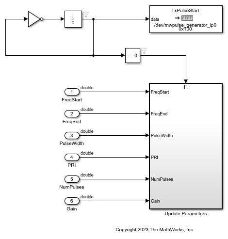The Pulse Generator subsystem consists of the Pulse Generator Control and NCO LFM Generator subsystems. Use the Pulse Generator Control subsystem to define parameters that determine the timing of the signal generator, number of pulses, pulse repetition interval (PRI), and pulse width. You can configure these parameters at run time over an AXI4-Lite connection. The NCO LFM Generator subsystem then generates the linear FM waveform using a vector-based NCO. Use this subsystem to set parameters that determine the frequency characteristics of the waveform, such as the starting frequency and frequency step size.