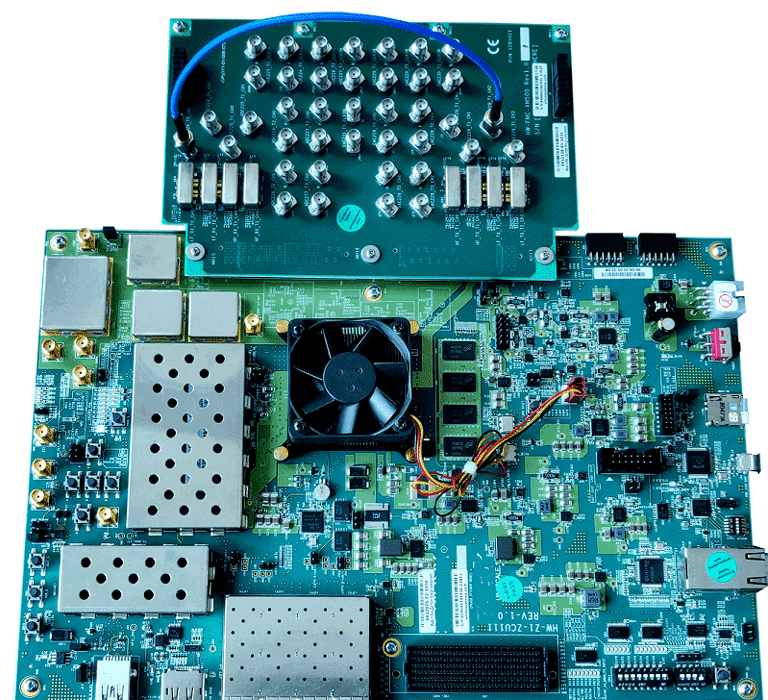AMD Zynq UltraScale+ RFSoC ZCU216 evaluation kit with an XM655 balun card.