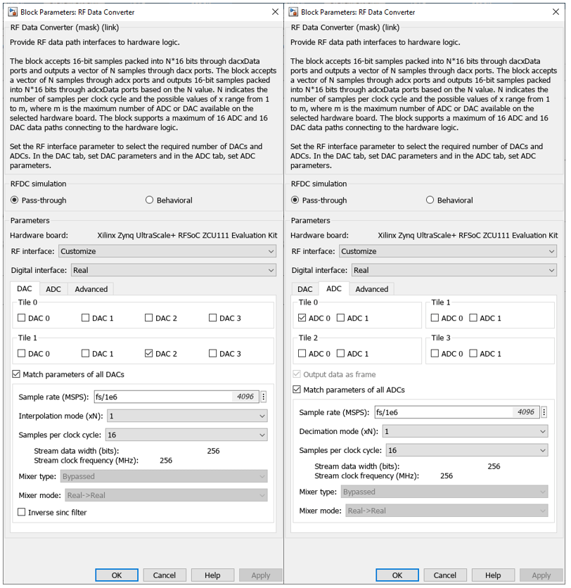 3. To select specific ADCs and DACs, set RF Interface to Customize. To user the real interface, set the Digital interface to Real.