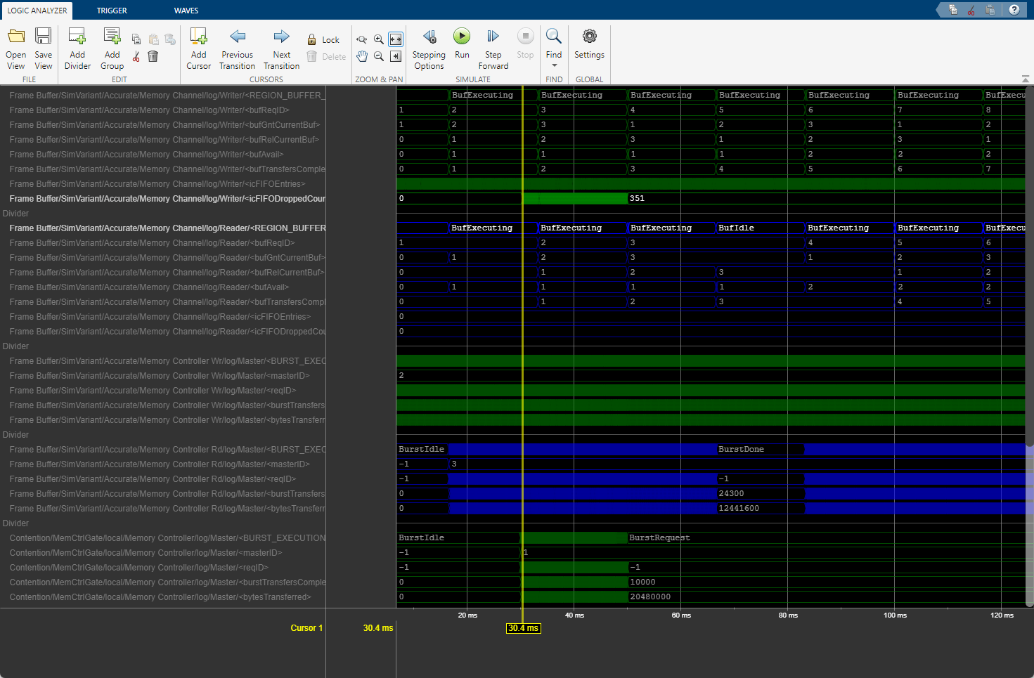 As you can see, at around 0.03s - when the secondary algorithm begins memory access requests, the other masters do not achieve their required throughput. The logic analyzer waveform shows this effect as dropped buffers for the Frame Buffer write master and the idle state for the Frame Buffer read master.