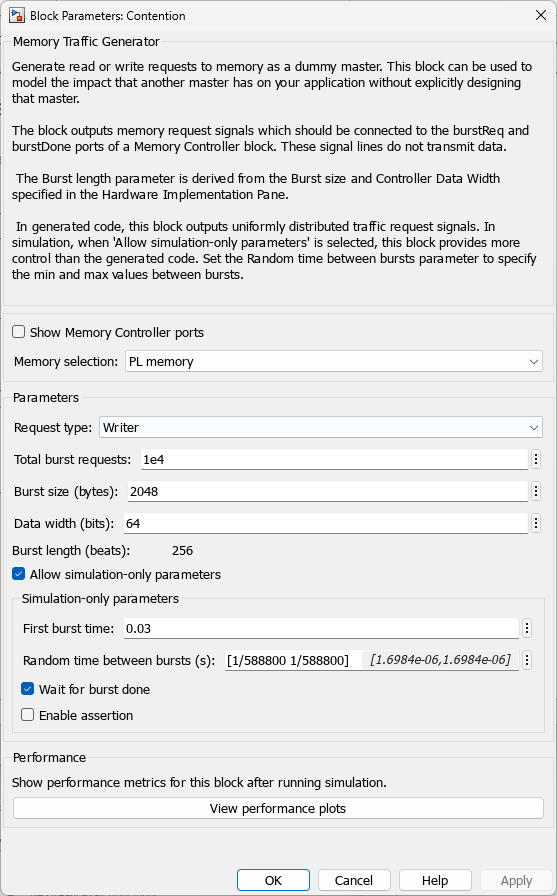 To enable the modeling of the secondary algorithm memory access, uncomment the Contention Memory Traffic Generator block. The block mask settings are shown below.