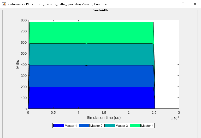 Run the model. After completion of simulation, open the Memory Controller block and click on View performance plots under Performance tab. Select all the masters under Bandwidth tab and click Create Plot. You can notice that all masters roughly achieved a bandwidth of 190 MBps and did not meet the required 248 MBps. It is also observed by the warnings in the diagnostic viewer.