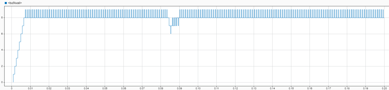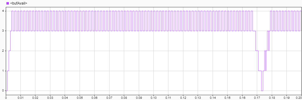 By default, the model is configured with case #3 parameters by default. Simulate the top model, and Click Data Inspector from the Simulation tab. Add bufAvail signals on the top view. In this case, the available software buffer signal does not drop to zero, and validDropLED in the top model does not light up, indicating that the data is streamed continuously.