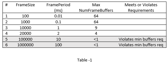 Design to Meet Latency Requirement: Begin with a few potential frame sizes and calculate the frame period for each frame size in Table-1. The frame period is the time between two consecutive frames from the FPGA to processor. For this example, the FPGA output sample time is 1/10e6, or 1e-7, as the FPGA algorithm runs at 10 MHz. The frame period is calculated as