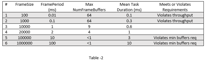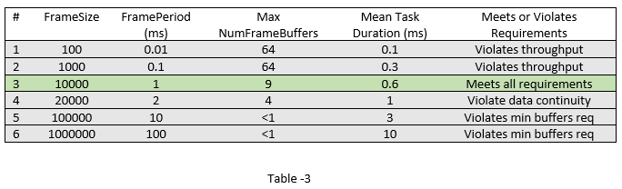 Various ways exists for obtaining mean task durations corresponding to frame sizes for your algorithm. These concepts are covered in the Task Execution example. Mean task durations for various frame sizes are captured in the following Table-2. Because the mean task duration is greater than the calculated frame period, case #1 and #2 violate the throughput requirement.