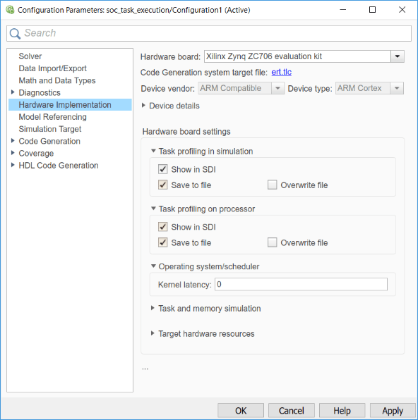 You can configure additional simulation and execution parameters for SoC Blockset in the model configuration dialog. Task profiling, in simulation and on processor, allows you to profile task execution, stream results to Data Inspector and save them into a file.