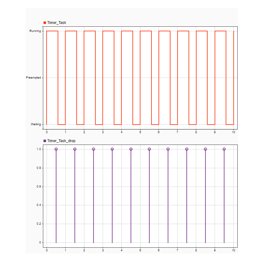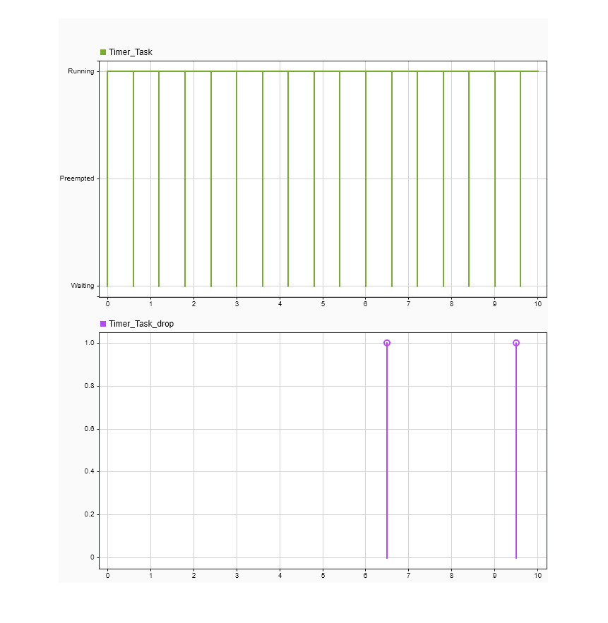 Using the same previously shown model, rather than overrunning the timer-driven task, the task drops so the next task instance starts at the 0.5-second interval. Open the Task Manager block dialog mask, and select Drop tasks that overrun. Run the model again. Open the Simulation Data Inspector to view the task execution and dropped task instances.