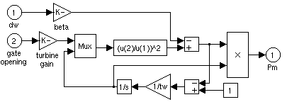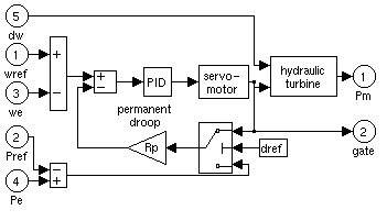 The Hydraulic Turbine and Governor block implements a nonlinear hydraulic turbine model, a PID governor system, and a servomotor [1].