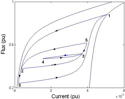 In transient conditions, an oscillating magnetizing current produces minor asymmetrical loops, as shown in the next figure, and all points of operation are assumed to be within the major loop. Loops once closed have no more influence on the subsequent evolution.