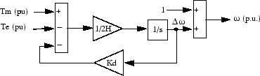 operation H = constant of inertia Tm = mechanical torque Te = electromagnetic torque Kd = damping factor representing the effect of damper windings ω(t) = mechanical speed of the rotor ω0 = speed of operation (1 p.u.) | (1) |