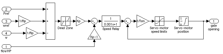 The speed governing system consists of a proportional regulator, a speed relay, and a servomotor controlling the gate opening. It is similar to one of the models proposed in [1].