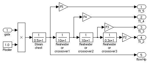 The steam turbine has four stages, each modeled by a first-order transfer function. The first stage represents the steam chest while the three other stages represent either reheaters or crossover piping. The boiler is not modeled and boiler pressure is constant at 1.0 pu. Fractions F2 to F5 are used to distribute the turbine power to the various shaft stages: