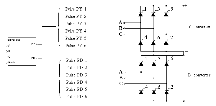 The Synchronized 12-Pulse Generator block generates two vectors of six pulses synchronized on the twelve thyristor commutation voltages. The first set of pulses, denoted PY, is sent to the six-pulse bridge connected to the wye (Y) secondary winding of the Y/Y/Delta converter transformer. The second set of pulses, denoted PD, is sent to the six-pulse bridge connected to the delta secondary winding of the converter transformer.