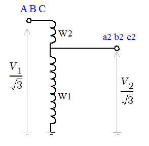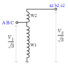 The following figure illustrates winding connections for one phase of an autotransformer when the three-phase windings are both connected in Yg.
