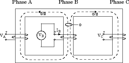 The following figure shows a three-limb core with a single three-phase winding. Only phase B is excited and voltage is measured on phase A and phase C. The flux Φ produced by phase B shares equally between phase A and phase C so that Φ/2 is flowing in limb A and in limb C. Therefore, in this particular case, if leakage inductance of winding B would be zero, voltage induced on phases A an C would be -k.VB=-VB/2. In fact, because of the leakage inductance of the three windings, the average value of induced voltage ratio k when windings A, B, and C are successively excited must be slightly lower than 0.5.