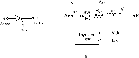 The thyristor device turns off when the current flowing in the device becomes 0 (Iak = 0) and a negative voltage appears across the anode and cathode for at least a period of time equal to the turnoff time Tq. If the voltage across the device becomes positive within a period of time less than Tq, the device turns on automatically even if the gate signal is low (g = 0) and the anode current is less than the latching current. Furthermore, if during turn-on, the device current amplitude stays below the latching current level specified in the dialog box, the device turns off after the gate signal level becomes low (g = 0).