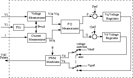 The series converter can operate either in power flow control (automatic mode) or in manual voltage injection mode. In power control mode, the measured active power and reactive power are compared with reference values to produce P and Q errors. The P error and the Q error are used by two PI regulators to compute respectively the Vq and Vd components of voltage to be synthesized by the VSC. (Vq in quadrature with V1 controls active power and Vd in phase with V1 controls reactive power). In manual voltage injection mode, regulators are not used. The reference values of injected voltage Vdref and Vqref are used to synthesize the converter voltage.